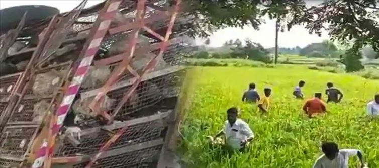 కొందరైతే ఒక కోడితో సరిపెట్టుకోలేదండి. రెండు చేతుల్లో వీలునన్ని పట్టుకుని అక్కడి నుంచి ఉడాయించారు. కాగా వరిపొలం రైతు కోళ్ల కోసం వచ్చినవారి పై ఆగ్రహం వ్యక్తం చేశాడు. కోళ్ల కోసం పొట్టకొచ్చిన వరి పొలాన్ని కూడా పట్టించుకోలేదంటూ సీరియస్ అయ్యాడు. కాగా 800 కోళ్లను మాయం చేసినట్టు డ్రైవర్ తెలిపాడు. ఈ ప్రమాదం లో అతడికి స్వల్ప గాయాలయ్యాయి. పాపం డ్రైవర్‌కు దెబ్బలు తగిలాయా అని ఎవరూ చూడలేదు. కోళ్లు చిక్కినవాళ్లు సాయంత్రం దావత్ అనకుంటూ సబంరంగా ఇంటికి వెళ్లారు.. ఫుల్లుగా లాగించారు..