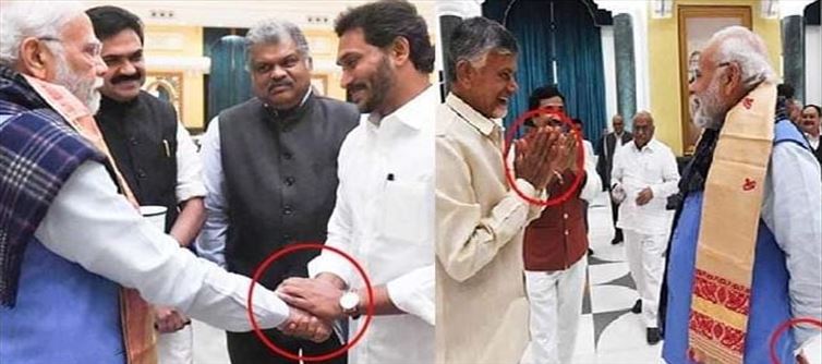 అయితే నానా అవస్తలుపడి ఎల్లోమీడియా కతలు అల్లేసిన తర్వాత పై ఫొటో బయటపడింది. ఈ ఫొటోలో జగన్ రెండుచేతుల మధ్య మోడీ చేయుంది. జగన్ నవ్వుతు ఏదో చెబుతుంటే మోడీ ఆసక్తిగా వింటున్నట్లుంది. ఇదే సమయంలో పక్కనే ఉన్న ఫొటోలో చంద్రబాబు నమస్కారం చేస్తుంటే మోడీ మాత్రం ఎటో చూస్తున్నట్లు కనబడుతోంది. పై ఫొటోల ద్వారా జగన్, చంద్రబాబు విషయంలో మోడీ వ్యవహరించిన విధానం అందరికీ అర్ధమైపోతోందని నెటిజన్లు కామెంట్లు పెడుతున్నారు. ఎల్లోమీడియా కష్టపడి అల్లని కతంతా ఒక్క ఫొటో దెబ్బకు గాలిలో కొట్టుకుపోయినట్లయ్యింది.