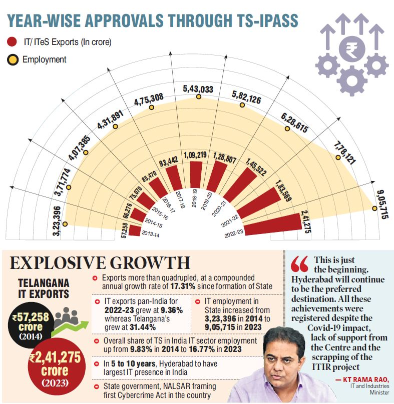 It's interesting to note that Telangana's IT exports in 2013–14 only totaled Rs 57,258 crore. Comparatively, the growth in State IT exports from 2021–22 during the previous fiscal was Rs 57,706 crore, according to IT and industries minister KT Rama Rao, who spoke on monday after the release of the IT Annual Report 2022–23. All export data was submitted by individual businesses and made available by the union government through the ministries of commerce and electronics and information technology.