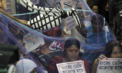 விட்ட மாநகராட்சியைக் கண்டித்து, இந்திய ஜனநாயக வாலிபர் சங்கத்தினர், கொசுவலையைப் போர்த்தியபடி