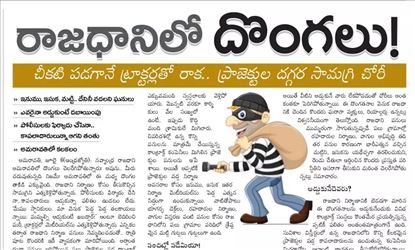 ఆంధ్రజ్యోతి దిన పత్రికలో ఆదివారం ఓ సంచలన కథనం వచ్చింది. ఏపీ రాజధాని అమరావతిలో దొంగలు చెలరేగిపోతున్నారన్నది దాని సారాంశం. అయితే ఈ దొంగలు ఇళ్లలో సొమ్ములు దోచుకెళ్లే దొంగలు కాదు.. రాజధానిలో భారీగా జరుగుతున్న నిర్మాణాల వద్ద సామగ్రి దోచుకెళ్లే దొంగలు.