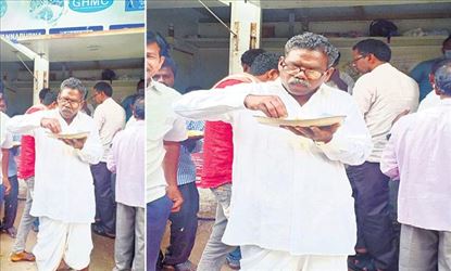 ఎమ్మెల్యే అంటే కనీసం కారు.. చుట్టూ నలుగురు అనుచరులు.. లేకుండా బయటకు కదలరు. కానీ గుమ్మడి నర్సయ్య చాలా సాదాసీదాగా ఉంటారు. ఆయన మంగళవారం హైదరాబాద్ లోని బాగ్లింగంపల్లి సుందరయ్య పార్కు వద్ద జీహెచ్ఎంసీ ఏర్పాటు చేసిన 5 రూపాయల భోజనం చేస్తూ కనిపించారు. ఆయన్ను గుర్తుపట్టినవారు ఆశ్చర్యపోయారు.
