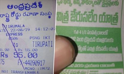 आंध्र प्रदेश स्टेट रोड ट्रांसपोर्ट कॉर्पोरेशन (APSRTC) के द्वारा जारी की हुई एक बस टिकट सोशल मीडिया पर वायरल हो रही है जिसमें एक तरफ बस टिकट का किराया लिखा हुआ है जबकि टिकट के दूसरी तरफ यरूशलम के तीर्थ स्थल पर्यटन का विज्ञापन दिया गया है।