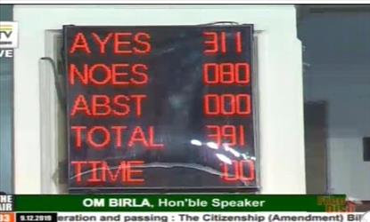 দীর্ঘ আলোচনার পর শেষ পর্যন্ত মধ্য রাতে লোকসভায় পাস হয়ে গেল ‘নাগরিকত্ব সংশোধনী বিল’ (Citizenships Amendment Bill -CAB) । বিলের পক্ষে ৩১১ ভোট। বিলের বিপক্ষে ৮০টি ভোট পড়ে।