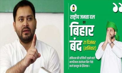 नयी दिल्ली। नागरिकता संशोधन कानून के खिलाफ राष्ट्रीय जनता दल ने आज "बिहार बंद" का आह्वान किया है। नेता प्रतिपक्ष तेजस्वी यादव इसके लिए कई दिनों से तैयारी में लगे थे और लोगों से इस बाबत समर्थन मांग रहे थे, इसके लिए पार्टी के कार्यकर्ता संपर्क अभियान में जुटे हुए थे।