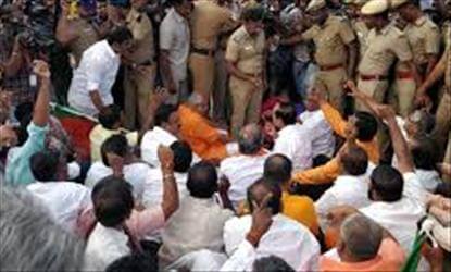Accordingly tamilnadu bjp, on tuesday, had announced a dharna protest near the gandhi Statue on marina beach if the police do not arrest tamil orator Nellai Kannan by tuesday night. On wednesday, bjp workers from tamilnadu including leaders H Raja, former Union minister Pon Radhakrishnan, former State President of bjp CP Radhakrishnan and bjp National Council Member La Ganesan reached marina beach around 4.15 pm and sat in dharna in front of the gandhi statue, demanding that the police arrest Nellai Kannan immediately for his comments on prime minister narendra modi and Union home minister amit Shah.
