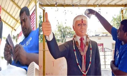 तेलंगाना के रियल एस्टेट ब्रोकर बुस्सा कृष्णा अमेरिकी राष्ट्रपति डोनाल्ड ट्रम्प के फैन हैं। वह 4 साल से उनकी भगवान की तरह पूजा कर रहे हैं। उन्होंने ट्रम्प की 6 फीट ऊंची मूर्ति भी बनवाई है। अब वे ट्रम्प के भारत के दो दिवसीय दौरे के दौरान उनसे मिलना चाहते हैं। इसके लिए मोदी सरकार से गुहार लगाई है।