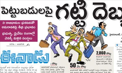 అమరావతికి వచ్చిన గుర్తింపుతో దాదాపు రూ.లక్ష కోట్లకు పైగా ప్రభుత్వ, ప్రైవేటు పెట్టుబడులకు రంగం సిద్ధమైన తరుణంలో జగన్ తీసుకున్న నిర్ణయం రాష్ట్రాన్ని ఇబ్బందుల్లోకి నెడుతోందని ఈనాడు తన కథనంలో పేర్కొంది. అమరావతి రాజధానిగా కొనసాగి ఉంటే.. ఏమేం జరిగేదో.. ఎన్ని వేల కోట్ల పెట్టుబడులు వచ్చేవో చెబుతూ ఓ కథనాన్ని ప్రముఖంగా ప్రచురించింది. అంతే కాదు.. ఇప్పుడు నిర్మాణదారులంతా హైదరాబాద్, బెంగళూరు, చెన్నైలకు వెళ్లిపోతున్నారని రాసుకొచ్చింది.