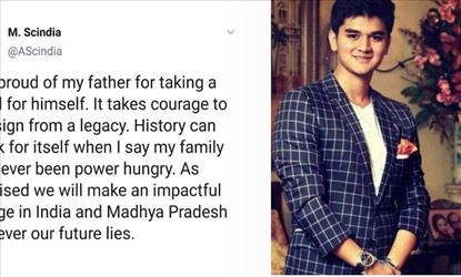 महानारायण सिंधिया ने ट्वीट किया, "मुझे अपने पिता पर खुद के लिए एक स्टैंड लेने के लिए गर्व है। एक विरासत से इस्तीफा देने के लिए साहस चाहिए। इतिहास खुद के लिए बोल सकता है जब मैं कहता हूं कि मेरा परिवार कभी भी भूखा नहीं रहा। जैसा कि वादा किया गया है कि हम भारत में एक प्रभावशाली बदलाव करेंगे। और मध्य प्रदेश जहां भी हमारा भविष्य है।"