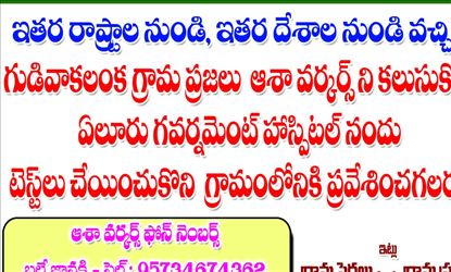 ఇతర రాష్ట్రాల నుంచి, ఇతర దేశాల నుంచి వచ్చిన వారు తప్పనిసరిగా పరీక్షలు చేయించుకోవాలని... ఆశా వర్కర్స్ సహాయంతో ఏలూరు ప్రభుత్వ ఆస్పత్రిలో పరీక్షలు చేయించుకుని కరోనా లేదని నిర్ధారణ అయితే మాత్రమే గ్రామంలోకి ప్రవేశించాలని సూచించారు. ఊరి బయట ఇతర రాష్ట్రాలు, విదేశాల నుంచి వచ్చిన వారి కోసం సూచనలతో పాటు ఆశా వర్కర్ల పేర్లు, ఫోన్ నంబర్లతో కూడిన ఫ్లెక్సీని పెట్టారు.