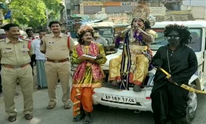 मृत्यु के देवता यमराज और न्याय के देवता चित्रगुप्त और घातक कोरोनावायरस को बुधवार को आंध्र प्रदेश के कुरनूल के डोन शहर की सड़कों पर देखे गए, ताकि कोरोनोवायरस के खतरों के बारे में जागरूकता फैलाई जा सके।