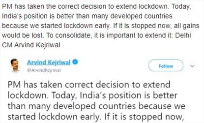 ഇന്ന്, വികസിത രാജ്യങ്ങളെ അപേക്ഷിച്ച് ഇന്ത്യയുടെ സ്ഥാനം മികച്ചതാണെന്നും, കാരണം തങ്ങൾ നേരത്തെ ലോക്ക്ഡൗൺ ആരംഭിച്ചെന്നതാണെന്നും അദ്ദേഹം പറഞ്ഞു. ലോക്ക് ഡൗൺ ഇപ്പോൾ അവസാനിപ്പിച്ചാൽ ഇതുവരെയുള്ള എല്ലാ നേട്ടങ്ങളും ഇല്ലാതാകുമെന്നും നീട്ടേണ്ടത് ആവശ്യമാണെന്നും കെജ്രിവാൾ ട്വീറ്റ് ചെയ്തു.