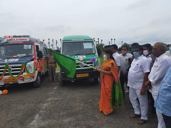 పశ్చిమగోదావరి జిల్లా కొవ్వూరు నియోజకవర్గానికి సంభందించిన 108, 104 అంబులెన్స్ లను క్యాంపు కార్యాలయం నందు రాష్ట్ర స్త్రీ శిశు సంక్షేమ శాఖ మంత్రినివర్యులు శ్రీమతి తానేటి వనిత ప్రారంభించారు.