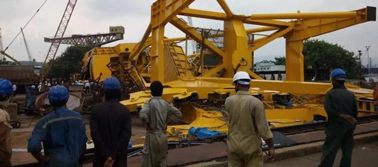 नीचे गिरते हुए क्रेन के नाटकीय दृश्य सामने आए हैं क्योंकि शिपयार्ड के लोग डरावने रूप में खड़े थे।