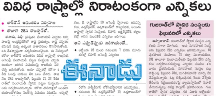 కేంద్ర ఎన్నికల సంఘం జూన్ 19న రాజ్యసభ ఎన్నికలను విజయవంతంగా నిర్వహించిందని... నాటి నుంచి నేటి వరకూ దేశంలో వివిధ రాష్ట్రాల్లో వరుసగా ఎన్నికలు జరుగుతూ వస్తున్నాయని ఈనాడు రాసింది. బిహార్లో అసెంబ్లీ ఎన్నికలు, 11 రాష్ట్రాల్లోని 59 అసెంబ్లీ స్థానాలకు ఉపఎన్నికలు, ఉత్తర్ప్రదేశ్, ఉత్తరాఖండ్లో రాజ్యసభకు, అయిదు రాష్ట్రాల్లో స్థానిక సంస్థలకు, బిహార్, ఉత్తర్ప్రదేశ్, కర్ణాటకల్లో శాసన మండలికి ఎన్నికలు జరిగిన విషయాన్ని గుర్తు చేసింది.
