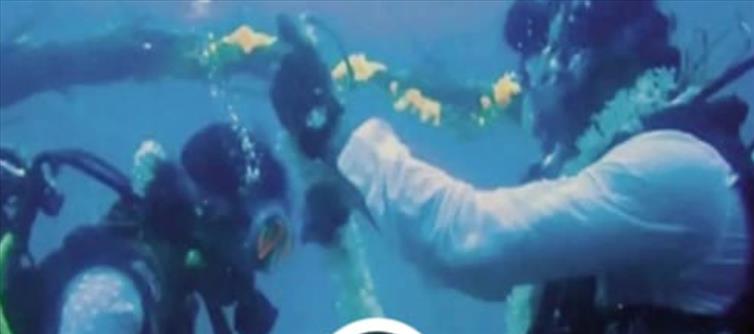చెన్నైకి చెందిన శ్వేత, చిన్నదురై అనే ఇద్దరు యువతీ యువకులు సముద్రం నీటి లోపల హిందూ సంప్రదాయం ప్రకారం వివాహం చేసుకోవడం ప్రస్తుతం ఆసక్తికరంగా మారిపోయింది. దీనికి సంబంధించిన వీడియో ప్రస్తుతం సోషల్ మీడియాలో వైరల్ గా మారిపోయింది. అడ్వెంచర్ డైవ్ సెంటర్ సహాయంతో సముద్ర తీరానికి ఐదు కిలోమీటర్ల దూరంలో 60 అడుగుల నీటి లోపల.. హిందు సంప్రదాయం ప్రకారం పెళ్లి చేసుకున్నారు. ఈ అడ్వెంచర్ పెళ్లి కోసం ఏకంగా మూడు రోజులపాటు ట్రైనింగ్ తీసుకున్నారు ఈ జంట. అంతేకాదు పెళ్లి ఫీల్ రావడం కోసం నీటిలో అరటి తోరణాలు కూడా ఏర్పాటు చేశారు.