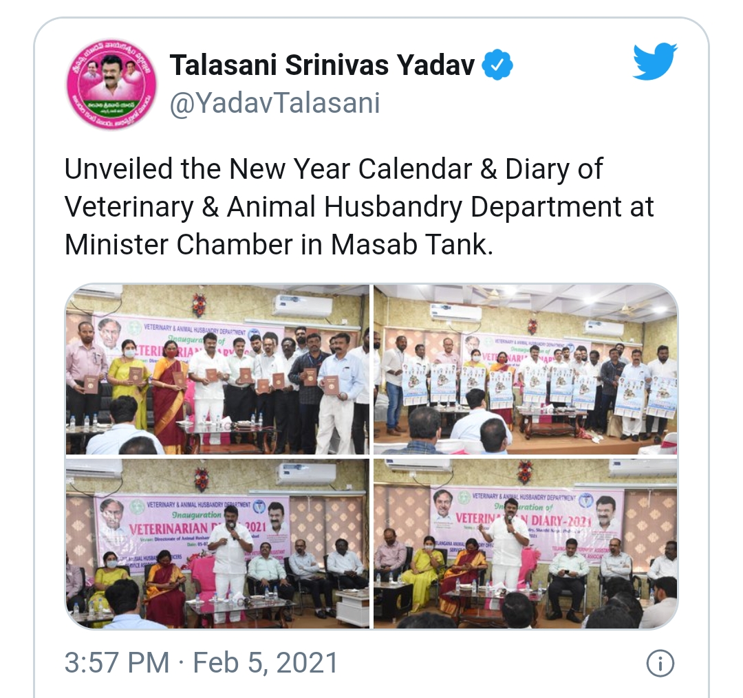 మంత్రి పశుసంవర్ధకశాఖ అధికారుల నూతన సంవత్సర డైరీ, క్యాలెండర్ను ఆవిష్కరించారు. పెద్ద ఎత్తున గొర్రె పిల్లలు అందించడం,