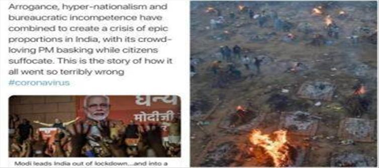 കോവിഡിനോടനുബന്ധിച്ചു മോദി ഇന്ത്യയെ ദുരന്തത്തിലേക്ക് നയിക്കുന്നെന്ന് ഓസ്ട്രേലിയൻ മാധ്യമം! 'മോദി ഇന്ത്യയെ മഹാദുരന്തത്തിലേക്ക് നയിക്കുന്നു' എന്ന തലക്കെട്ടിൽ വാർത്ത നൽകിയ 'ദ ഓസ്ട്രേലിയൻ' എന്ന പത്രത്തിനെതിരെയാണ് ഇന്ത്യൻ ഹൈക്കമ്മീഷൻ രംഗത്തെത്തിയത്. ഇന്ത്യയിലെ കൊവിഡ് വ്യാപനത്തെക്കുറിച്ച് വാർത്ത നൽകിയ ഓസ്ട്രേലിയൻ മാധ്യമത്തിനെതിരെ ഇന്ത്യൻ ഹൈക്കമ്മീഷൻ ഇടപെടൽ നടത്തി കൊണ്ടിരിക്കുകയാണ്. 'ദ ഓസ്ട്രേലിയൻറെ' എഡിറ്റർക്ക് ഇക്കാര്യം ആവശ്യപ്പെട്ട് ഡെപ്യൂട്ടി ഹൈക്കമ്മീഷണർ പിഎസ് കാർത്തികേയനാണ് നോട്ടീസ് അയച്ചത്. ഇന്ത്യയിലെ കൊവിഡ് മാനേജ്മെൻറിനെക്കുറിച്ച് വാർത്ത തിരുത്തണമെന്നും ഭാവിയിൽ ഇത്തരത്തിൽ അടിസ്ഥാനവിരുദ്ധമായ ലേഖനങ്ങൾ പ്രസിദ്ധീകരിക്കന്നതിൽ നിന്ന് വിട്ട് നിൽക്കണമെന്നുമാണ് ഹൈക്കമ്മീഷൻ ആവശ്യപ്പെട്ടത്. ഇന്ത്യയിലെ കൊവിഡ് പ്രതിരോധ പ്രവർത്തനങ്ങളെയും വാക്സിനേഷനെയും കുറിച്ചും ഹൈക്കമ്മീഷൻ നോട്ടീസിൽ പ്രതിപാദിക്കുന്നുണ്ട്.