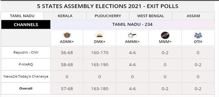 The assembly elections for tamil Nadu ended on april 6th and the vote counting will happen on May 2nd. Today the Exit Poll results are out and all the surveys are in favor of DMK winning the elections by a huge margin. Seeman's Naam Tamizhar, Kamal Haasan's Makkal Neethi Maiam will never win a single seat as per their survey report.