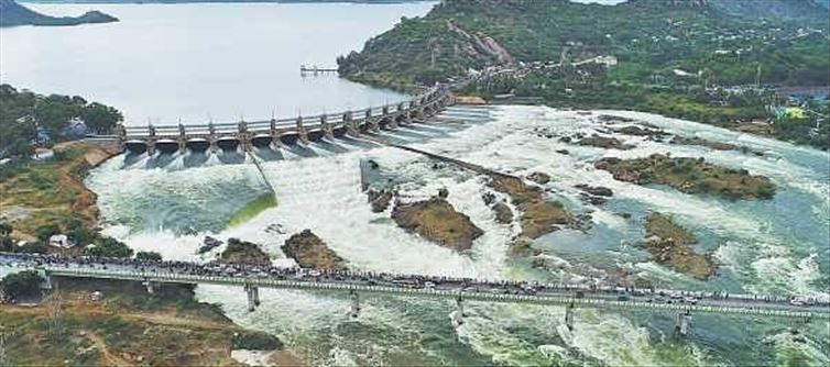 Water is constantly being released into the Cauvery from the Kabini and krishna Rajasagar dams in Karnataka. This water crosses the tamil Nadu-Karnataka border and reaches Okkaenakkal. More than 8,000 cubic feet of water is currently flowing into Okkaenakkal. Thus the water gushes out of all the waterfalls, including Main Falls, Five Falls, and Cinnaballs.
