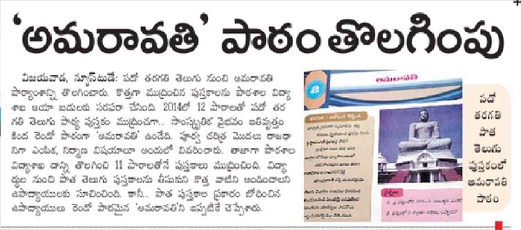 ఈ అమరావతి పాఠంలో పూర్వ చరిత్ర మొదలు రాజధానిగా ఎంపిక, నిర్మాణ విషయాలూ సవివరంగా ఉన్నాయి. ఇప్పుడు పాఠశాల విద్యాశాఖ అమరావతి పాఠాన్ని తొలగించేసింది. మొత్తం 11 పాఠాలతోనే పుస్తకాలు ముద్రించింది. అంతే కాదు.. విద్యార్థుల నుంచి పాత తెలుగు పుస్తకాలను తీసుకుని కొత్త వాటిని అందించాలని ఉపాధ్యాయులకు ఆదేశాలు జారీ చేసింది. అయితే.. పాత పుస్తకాల ప్రకారం బోధించిన ఉపాధ్యాయులు ఇప్పటికే రెండో పాఠమైన అమరావతిని బోధించేశారు.