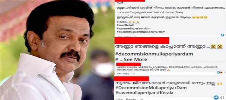 'രക്ഷിക്കണം സാർ, ജീവൻ എടുക്കരുത്.. പ്ലീസ്'; സ്റ്റാലിൻ്റെ ഫേസ്ബുക്ക് പേചില മലയാളികളുടെ അഭ്യർഥന! വെള്ളം എടുത്തോളൂ, ജീവൻ എടുക്കരുത്' എന്ന കമൻ്റുകളാണുള്ളത്. മുല്ലപ്പെരിയാർ ഡാം അണക്കെട്ട് ഡി കമ്മീഷൻ ചെയ്യണമെന്ന കാമ്പയിൻ കേരളത്തിൽ ശക്തമാകുന്നതിനിടെയാണ് തമിഴ്നാട് മുഖ്യമന്ത്രിയുടെ ഫേസ്ബുക്ക് പേജിൽ അഭ്യർത്ഥനയുമായി എത്തിയത്. കേരളത്തിൽ മഴ ശക്തമായി തുടരുന്നതിനിടെ മുല്ലപ്പെരിയാർ അണക്കെട്ടിൽ ജലനിരപ്പ് ആശങ്കപ്പെടുത്തുന്ന പശ്ചാത്തലത്തിൽ തമിഴ്നാട് മുഖ്യമന്ത്രി എം കെ സ്റ്റാലിൻ്റെ ഔദ്യോഗിക ഫേസ്ബുക്ക് പേജിൽ മലയാളികളുടെ അഭിപ്രായപ്രകടനം. തമിഴ്നാടിന് വെള്ളം നൽകാൻ മടിയില്ലെന്നും, എന്നാൽ മുല്ലപ്പെരിയാർ അണക്കെട്ട് സുരക്ഷിതമാണെന്ന വാദം ഉപേക്ഷിക്കണമെന്നും കമൻ്റുകളുണ്ട്.