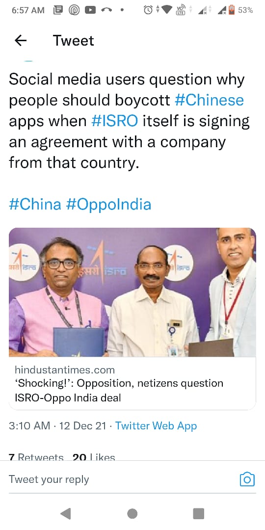 భారత అంతరిక్ష సంస్థ ఇస్రో, చైనా దేశానికి చెందిన ఎలక్ట్రానిక్స్ దిగ్గజ సంస్థ ఒప్పో కు చెందన భారత్ విభాగం మధ్య ఒప్పందం వివాదాన్ని రేకెత్తించింది, రాజకీయ నాయకులు నెటిజన్లు ఈ ఒప్పందంపై భారత అంతరిక్ష సంస్థను ప్రశ్నిస్తున్నారు,