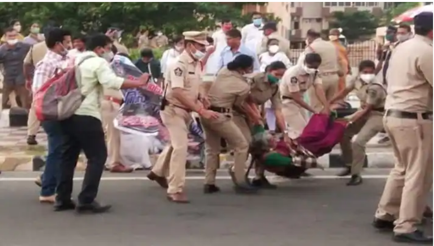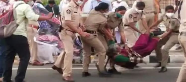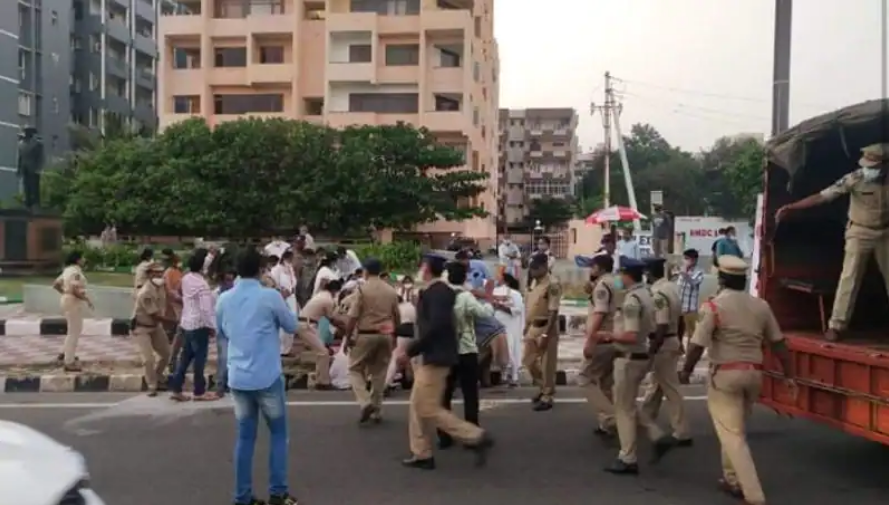 Employees took to the road at kurupam Circle on beach Road to bring their problems to the attention of the CM. police arrested them. The leaders who led it were dragged away.