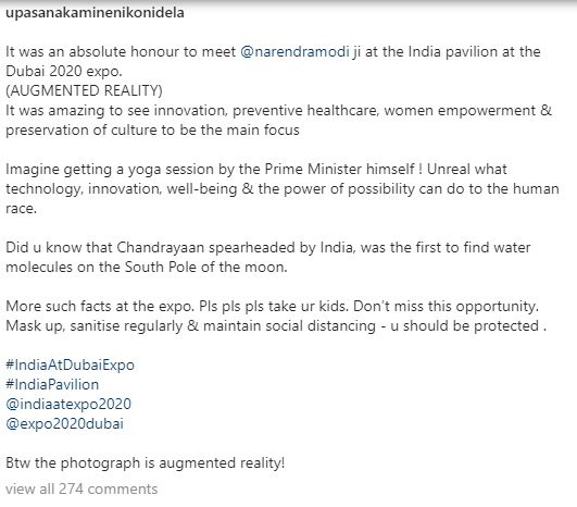 With this, some people are mistaken that upasana met prime minister Modi. But that is not the case. She was photographed sitting next to prime minister Modi through augmented reality. She even mentioned this herself in her instagram post. But, some sites misunderstood and reported that upasana had met Modi face to face. With this, the name upasana became trending on social media.