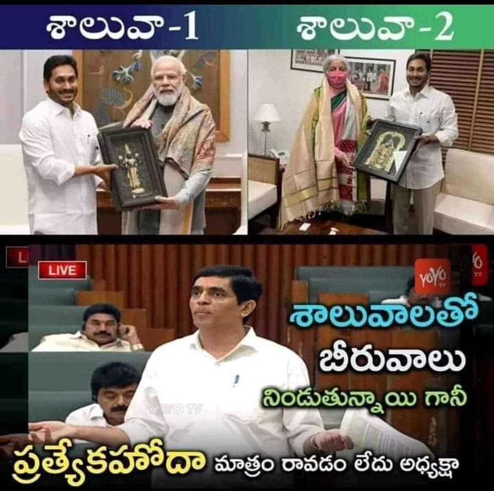 అందుకే అప్పుల్లో ఆంధ్రాను ఉంచి,ఢిల్లోలో బేరసారాలు నడపడంతో శాలువా 1,శాలువా 2 దృశ్యాలు తెగ వైరల్ అవుతున్నాయి.శాలువ-1 అనగా ప్రధానితో తీసుకున్న