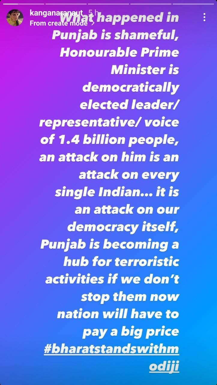 "What occurred in punjab is disgusting, Honourable prime minister is democratic elected commander of 1.4 billion people, an attack on him is an attack on every single Indian," kangana posted on her instagram stories. punjab is becoming a centre for terroristic operations, and if we do not even prevent them immediately, the nation will pay a high price #bharatstandswithm."
