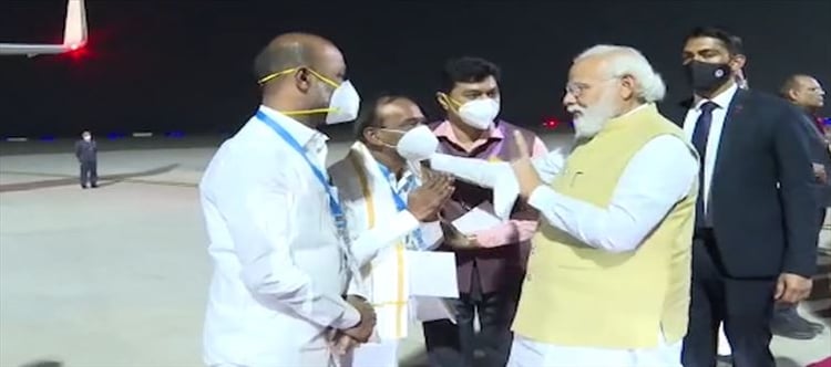 రాష్ట్ర పర్యటనను ముగించుకుని తిరిగి ఢిల్లీ వెళ్లేందుకు శంషాబాద్ విమానాశ్రయానికి వచ్చిన ప్రధానమంత్రి నరేంద్ర మోదీకి వీడ్కోలు పలికేందుకు ఎంపీ బండి సంజయ్, కె.లక్ష్మణ్, హుజూరాబాద్ ఎమ్మెల్యే ఈటల రాజేందర్ వచ్చారు. వీరితో పాటు మాజీ ఎంపీలు జి.వివేక్ వెంకటస్వామి, చాడా సురేష్ రెడ్డి, సీఎం రమేశ్ కూడా ఉన్నారు. మోదీ ఆయా నేతలందరితో అభివాదం చేస్తూ పలకరించారు. పక్కనే ఉన్న ఈటల రాజేందర్ ను బండి సంజయ్ మోదీకి పరిచయం చేశారు.