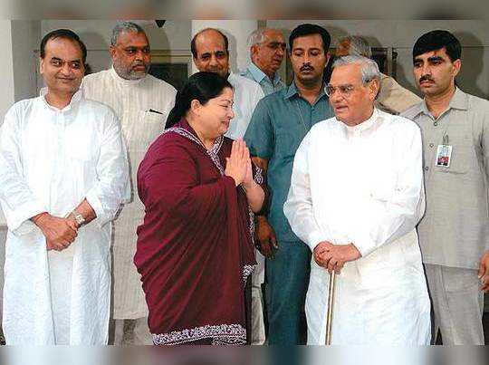 Jayalalithaa was a politician who shook the roots of former prime minister Atal Bihari Vajpayee's power and brought down the Vajpayee government at the Center for just 13 months by just one vote. In march 1999, a meeting between congress leaders sonia gandhi and jayalalithaa at a tea party shook the Vajpayee government, and it was in this tea party that jayalalithaa agreed to withdraw support to the Vajpayee government. The result was that jayalalithaa was recorded in history due to the fall of the government by one vote. However, in the general elections held again, the nda government was formed.