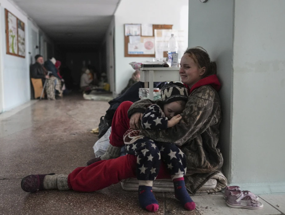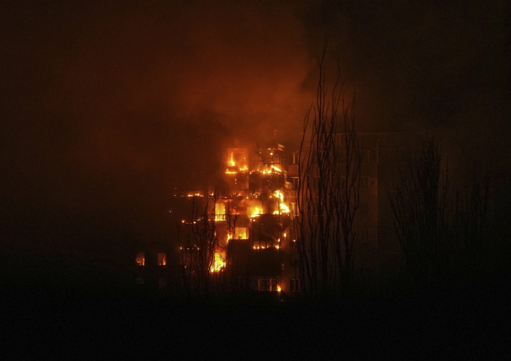 మారియుపోల్లో దాడులు పిల్లల మరియు ప్రసూతి ఆసుపత్రి మార్చి 9న ఆరోపించిన రష్యన్ క్షిపణి దాడికి గురైంది. ఈ చిత్రంలో, మార్చి 11 న షెల్లింగ్ ఫలితంగా మంటల్లో అపార్ట్మెంట్ భవనం చూడవచ్చు. ఈ చిత్రంలో, ఒక మహిళ మారియుపోల్లోని ఆసుపత్రి కారిడార్లో తన ముగ్గురు పిల్లలలో మిగిలి ఉన్న ఒక బిడ్డను కౌగిలించుకుని ఏడుస్తుంది.