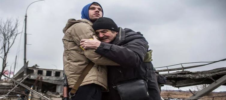 ఉక్రేనియన్ టెరిటోరియల్ డిఫెన్స్ ఫోర్సెస్ సభ్యుడు ఇర్పిన్లో రష్యన్ ఫిరంగి షెల్లింగ్ తరువాత తన సొంత పట్టణాన్ని విడిచిపెట్టిన నివాసిని కౌగిలించుకున్నాడు. ఉక్రెయిన్పై రష్యా దాడి చేసి పద్దెనిమిది రోజులైంది. సాధారణ వ్యక్తులు సాధారణ పనులు చేసే సాధారణ దేశం, బాంబు షెల్టర్లలో దాక్కుని వైమానిక దాడుల సైరన్లు వినడం ఆనవాయితీగా మారిన దేశంగా రూపాంతరం చెందడాన్ని కన్నీరు కార్చక తప్పదు. అంతకుముందు, ఉక్రెయిన్ ప్రతి సంవత్సరం మిలియన్ల మంది పర్యాటకులను ఆకర్షించింది. నల్ల సముద్రం తీరప్రాంతం, చర్చిలు, స్కీయింగ్ మరియు హైకింగ్కు అనువైన పర్వత శ్రేణులు మరియు సాంప్రదాయ ఉక్రేనియన్ బీట్ సూప్ కోసం విదేశీయులు దేశానికి తరలివచ్చారు.