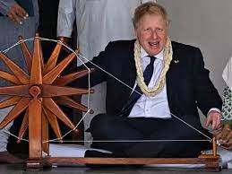 British prime minister Boris Johnson reached Sabarmati Ashram. He tried his hand at the spinning wheel at gandhi Ashram. He tried his hand at the spinning wheel at gandhi Ashram. Boris Johnson will also meet prime minister Narendra Modi tomorrow. He has become the first british PM to start a tour of india from Gujarat. Boris Johnson will also inaugurate a new factory of JCB (Bulldozer) in Gujarat.