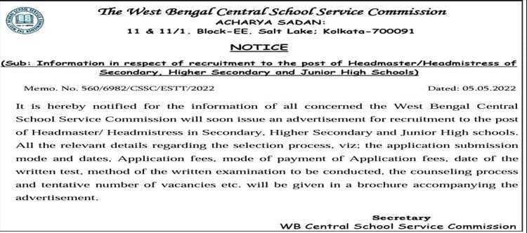 ২০১৬ সালে শেষবার মাধ্যমিক এবং উচ্চ মাধ্যমিক স্তরে শিক্ষক পদে নিয়োগ হয়েছিল। কিন্তু দুর্নীতির জটে দীর্ঘদিন ধরে থমকে ছিল নিয়োগ প্রক্রিয়া। অবশেষে রাজ্য সরকারের সবুজ সংকেত পেয়ে বৃহস্পতিবার কমিশনের তরফে জানানো হয়েছে, মাধ্যমিক এবং উচ্চ মাধ্যমিক স্কুলে সহকারি শিক্ষক নিয়োগের জন্য শীঘ্রই বিজ্ঞপ্তি প্রকাশ করা হবে। কবে থেকে আবেদন প্রক্রিয়া শুরু হবে, কতদিন আবেদন প্রক্রিয়া চলবে, আবেদন ফি, কীভাবে আবেদন করতে হবে, লিখিত পরীক্ষার দিন, কাউন্সেলিং প্রক্রিয়া এবং সম্ভাব্য শূন্যপদের সংখ্যার বিষয়টি বিজ্ঞপ্তিতে উল্লেখ করা থাকবে। নিয়োগ সংক্রান্ত যাবতীয় তথ্য (কবে থেকে আবেদন প্রক্রিয়া শুরু হবে, কতদিন আবেদন প্রক্রিয়া চলবে, আবেদন ফি, কীভাবে আবেদন করতে হবে, লিখিত পরীক্ষার দিন, কাউন্সেলিং প্রক্রিয়া এবং সম্ভাব্য শূন্যপদের সংখ্যা) শীঘ্রই প্রকাশ করা হবে বলে জানানো হয়েছে।
