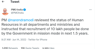 A tweet has been made by the Prime Minister's office for this step of the government. In a tweet made by the PMO, it has been told that PM narendra modi reviewed the human resource situation in all departments and ministries and directed that the government should recruit 10 lakh people in mission mode in the next 1.5 years.