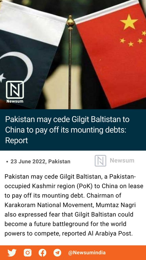 Pakistan may lease the Pakistan-occupied kashmir region (PoK) Gilgit-Baltistan (GB) to china to pay its mounting debt. Expressing apprehension, mumtaz, president of the Karakoram National Movement, said that isolated and neglected, Gilgit Baltistan could become a future battleground to compete for world powers.