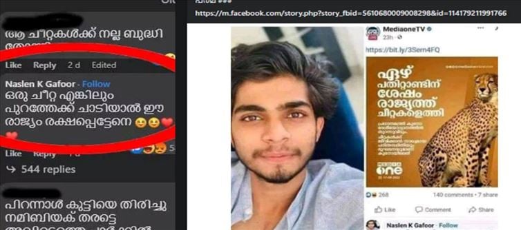 നസ്ലിന്റെ പേരിൽ കമന്റിട്ടത് യുഎഇയിൽ നിന്ന്; വിവാദം അറിഞ്ഞത് സുഹൃത്തുക്കൾ വഴി! യുഎഇയിൽ നിന്നുള്ള ഒരു അക്കൗണ്ടിൽ നിന്നാണ് ഫേസ്ബുക്കിൽ കമന്റിട്ടതെന്ന് സൈബർ സെൽ കണ്ടെത്തി. പ്രധാനമന്ത്രി നരേന്ദ്രമോദിയുടെ പിറന്നാൾ ദിവസം ഇന്ത്യയിലെത്തിച്ച ചീറ്റകളെ തുറന്നുവിട്ടെന്ന വാർത്തയ്ക്ക് താഴെയായിരുന്നു നസ്ലെന്റെതെന്ന പേരിൽ കമന്റിട്ടത്. സംഭവം വിവാദമായതോടെ അത് വ്യാജ അക്കൗണ്ട് ആണെന്നും തന്റെ പേരും ചിത്രവും ആരോ ദുരുപയോഗം ചെയ്തിരിക്കുകയാണെന്നും നസ്ലെൻ വ്യക്തമാക്കിയിരുന്നു.നടൻ നസ്ലെന്റെ പേരിൽ പ്രധാനമന്ത്രി നരേന്ദ്രമോദിക്കെതിരെ കമന്റിട്ടത് യുഎഇയിൽ നിന്നെന്ന് കണ്ടെത്തൽ. ആരോ ചെയ്ത പ്രവർത്തിക്ക് താനിപ്പോൾ പഴികേൾക്കുകയാണെന്നും ഇത് അതിഭീകരമാണെന്നും താരം വീഡിയോയിൽ പറഞ്ഞിരുന്നു.