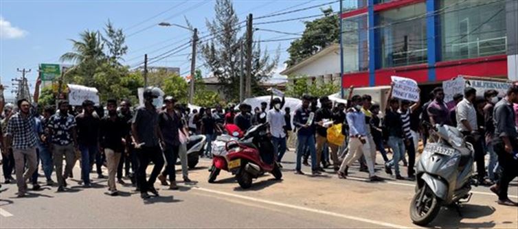 Jaffna university students protested against the arrest of former Northern Provincial Council member T. Ravikaran and social activist Rathinarasa Mayuran by the Mullaitivu police last night. The people of Thannimurpu and Kumumumuna areas took out a massive demonstration in Kurundurmalai yesterday against the efforts of the Department of Archeology to expropriate 632 acres of native land belonging to the tamil people surrounding Thannimuruppu and Kurundurmalai and the Buddhist construction is being carried out in defiance of the court order.