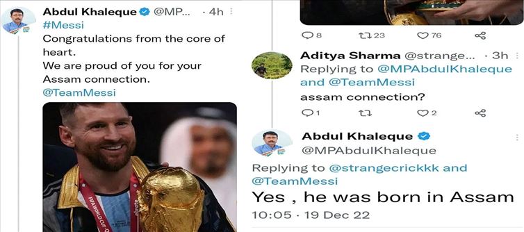 ലയണൽ മെസി ജനിച്ചത് അസമിൽ ആണെന്നായിരുന്നു എംപിയുടെ പോസ്റ്റ്. "ഹൃദയത്തിൻ്റെ അടിത്തട്ടിൽ നിന്നുള്ള ആശംസകൾ, താങ്കളുടെ അസം ബന്ധത്തിൽ ഞങ്ങൾ അഭിമാനിക്കുന്നു" - എന്നായിരുന്നു അസമിലെ ബാർപേട്ടയിൽ നിന്നുള്ള ലോക്സഭാ അംഗമായ അബ്ദുൽ ഖലീഖിൻ്റെ പോസ്റ്റ്. ഞായറാഴ്ച ലുസൈൽ സ്റ്റേഡിയത്തിൽ നടന്ന ലോകകപ്പ് ഫൈനൽ മത്സരത്തിൽ പെനാൽറ്റി ഷൂട്ടൗട്ടിൽ 4-2ന് ഫ്രാൻസിനെ പരാജയപ്പെടുത്തിയാണ് അർജൻ്റീന ലോകകപ്പ് സ്വന്തമാക്കിയത്. ഖത്തർ ലോകകപ്പിലെ അർജന്റീനയുടെ വിജയത്തിന് പിന്നാലെ അബുദുൽ ഖലിഖ് നടത്തിയ ട്വീറ്റ് സോഷ്യൽ മീഡിയ ഏറ്റെടുത്തു. എംപിയെ പരിഹസിച്ച് നിരവധിയാളുകൾ രംഗത്തുവന്നു. ലോകകപ്പിന് ശേഷം മെസിയും ഭാര്യയും അസം സന്ദർശിച്ചു' എന്നായിരുന്നു ഒരാളുടെ കമൻ്റ്.