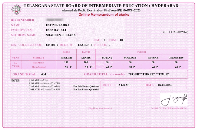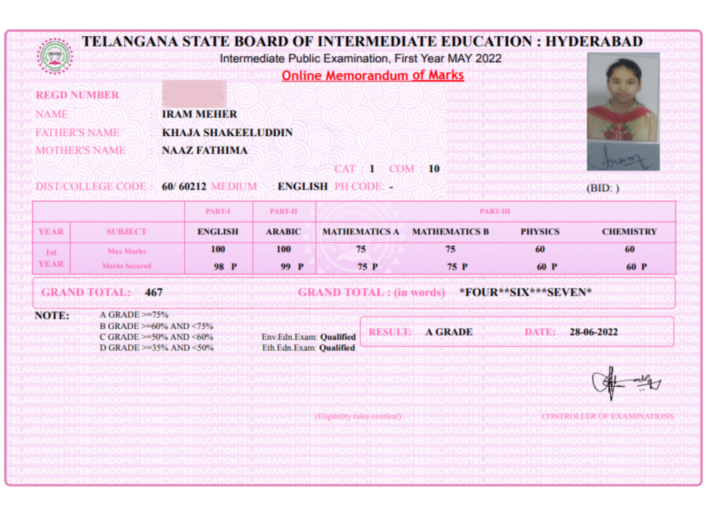 Iram has demonstrated excellence throughout her academic career. She achieved top scores in Telangana's intermediate exam last year as well, earning 467 out of 470 points. Iram received perfect scores in Chemistry (first year), Physics (first and second years), Mathematics IA, IIA, IB, and IIB. In addition to her, another applicant from the same college, BiPC student Fatima Zahra, finished first in the intermediate first-year exam with a score of 434 out of 440.