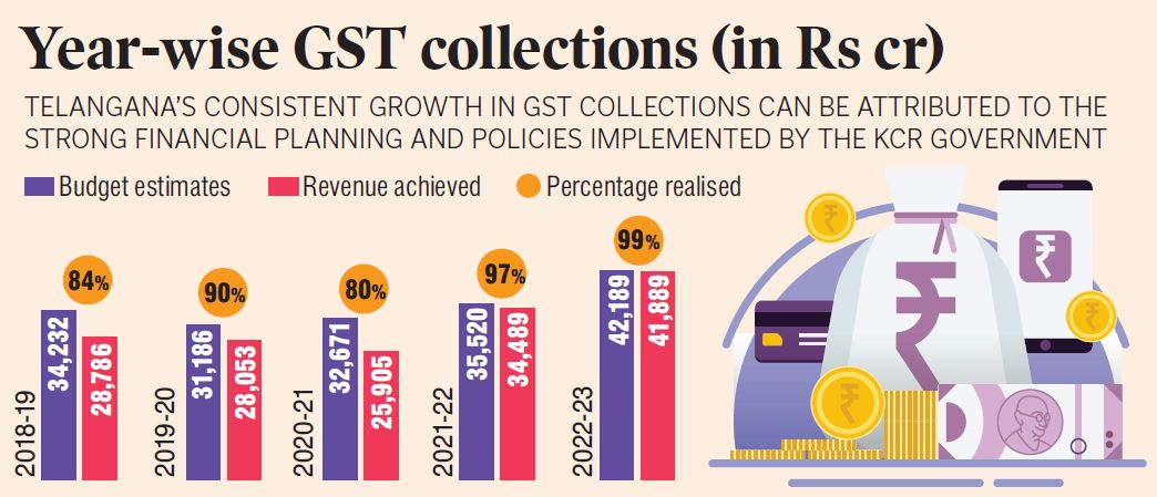 Similar to 2022–23, telangana collected Rs 41,889 crore, or 99 percent of the budget projections, as opposed to the expected collection of Rs 42,189 crore. The K Chandrashekhar Rao administration's sound financial management and policies are to blame for Telangana's ongoing rise in GST receipts. With improving financial conditions and rising buying power for its residents, the State has undergone considerable changes during the past nine years. Officials note that as a result, the business sector continued to flourish and contributed to the dramatic increase in GST income.