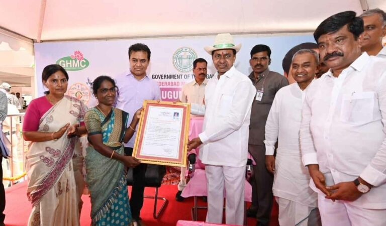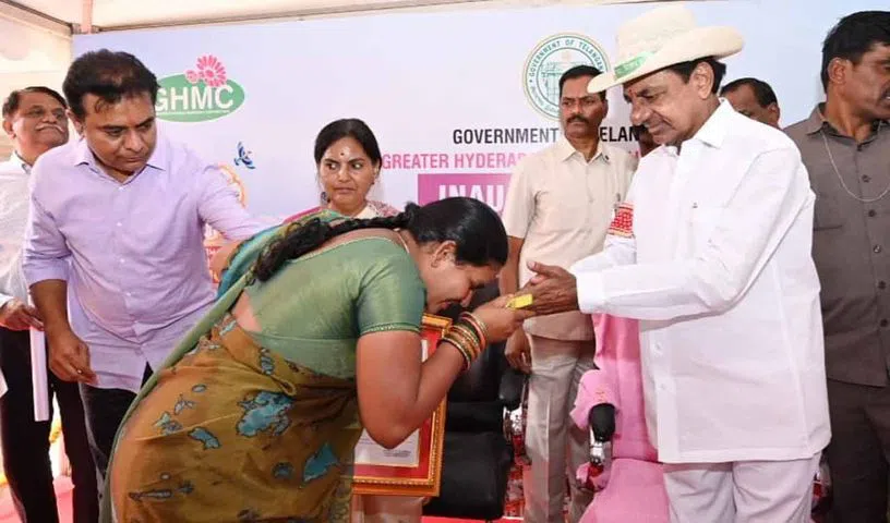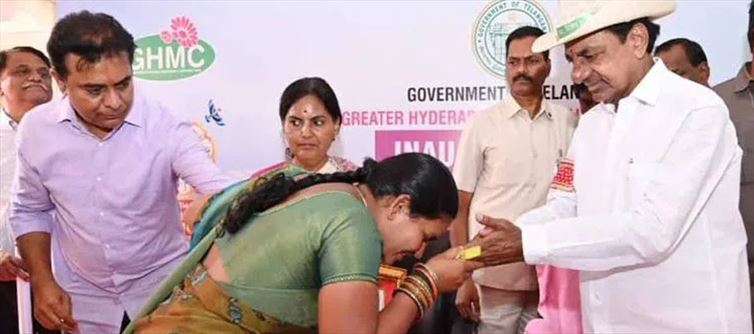 The chief minister was greeted upon his arrival as priests chanted Vedic chants. He launched the dignity housing project in front of several elected officials and representatives from hyderabad city, including Mayor Gadwal vijayalakshmi of the GHMC, Chief Secretary A Santhi Kumari, and Ministers KT Rama Rao, T Harish Rao, Vemula Prashanth Reddy, P Sabitha indra Reddy, Talasani srinivas Yadav, and Ch Malla Reddy.