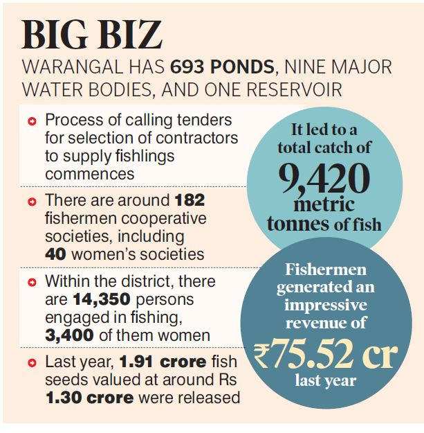 The procedure for requesting bids for the choice of the suppliers of the fishlings has already started in order to simplify this endeavour. The district's fishermen made Rs. 75.52 crore last year, according to naresh Kumar Naidu, the district's fisheries officer, who spoke to india Herald. Fisheries authorities disperse these fish seeds into ponds and reservoirs during the monsoon season. Notably, the Rayaparthi Mandal neighbourhood of Mylaram in the warangal district is home to one reservoir, nine significant water bodies, and a whopping 693 ponds.