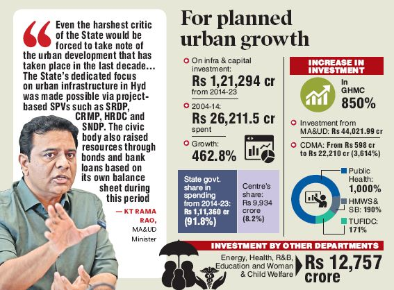 On Wednesday, MA&UD minister KT Rama Rao revealed this while publishing the department's 10-year report, "Driving Growth through Urbanisation," along with an action plan for the next year. He stated the government has spent Rs. 1,21,294 crore between 2014 and 2023. Comparatively, the previous administration spent Rs. 26,211.5 crore between 2004 and 2014, a rise of 462.8 percent.