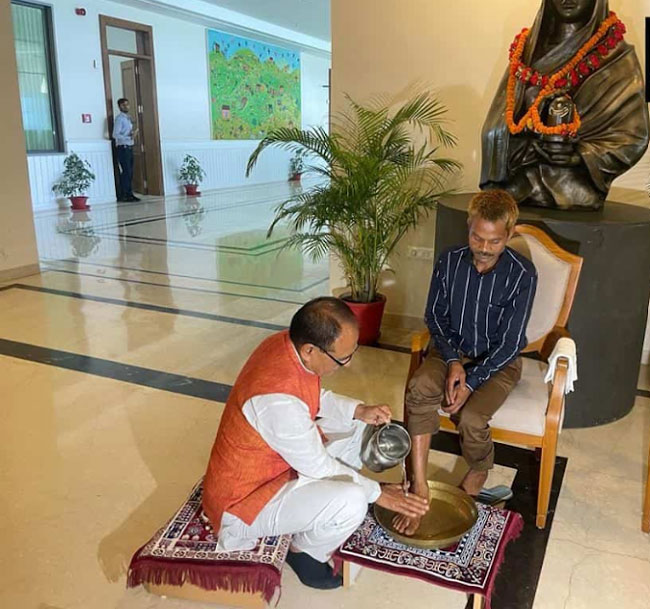 On the other hand, the bjp government in madhya pradesh has taken damage prevention measures after the video of the incident of pouring urine on a tribal member created a stir. madhya pradesh assembly elections will be held at the end of this year. In this context, chief minister shivraj singh chouhan was alarmed. chief minister shivraj singh chouhan has apologized to the tribal who was insulted by bjp leader Pravesh Shukla in Siddi district. The victim's feet were washed and he was honored with a shawl. Strict action was ordered against the accused Pravesh Shukla.CM shivraj singh chouhan had also tweeted earlier. He said that a video of a man urinating on another man in Siddi district is going viral on social media and the matter has come to his attention. He ordered the authorities to arrest the accused and register a case under the provisions of the National Security Act and take strict action. He expressed his grief that this incident deeply disturbed him. He said that he will meet the victim and his family members in Bhopal. In this context, shivraj singh chouhan met the victim Dashamat Rawat on July 6. cm Shivraj made Rawat sit on a chair and washed his feet. They honored him with a shawl and apologized. The CM's office shared the related photos on Twitter.