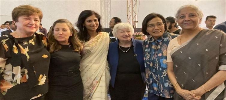 यह तस्वीर एक भव्य रात्रिभोज कार्यक्रम के दौरान ली गई थी, जिसमें आईएमएफ की पहली उप प्रबंध निदेशक, भारतीय मूल की गीता गोपीनाथ, आईएमएफ की प्रबंध निदेशक क्रिस्टालिना जॉर्जीवा, अमेरिकी ट्रेजरी सचिव जेनेट येलेन, इंडोनेशियाई वित्त मंत्री श्री मुल्यानी और कनाडाई वित्त मंत्री क्रिस्टिया फ्रीलैंड शामिल थीं।