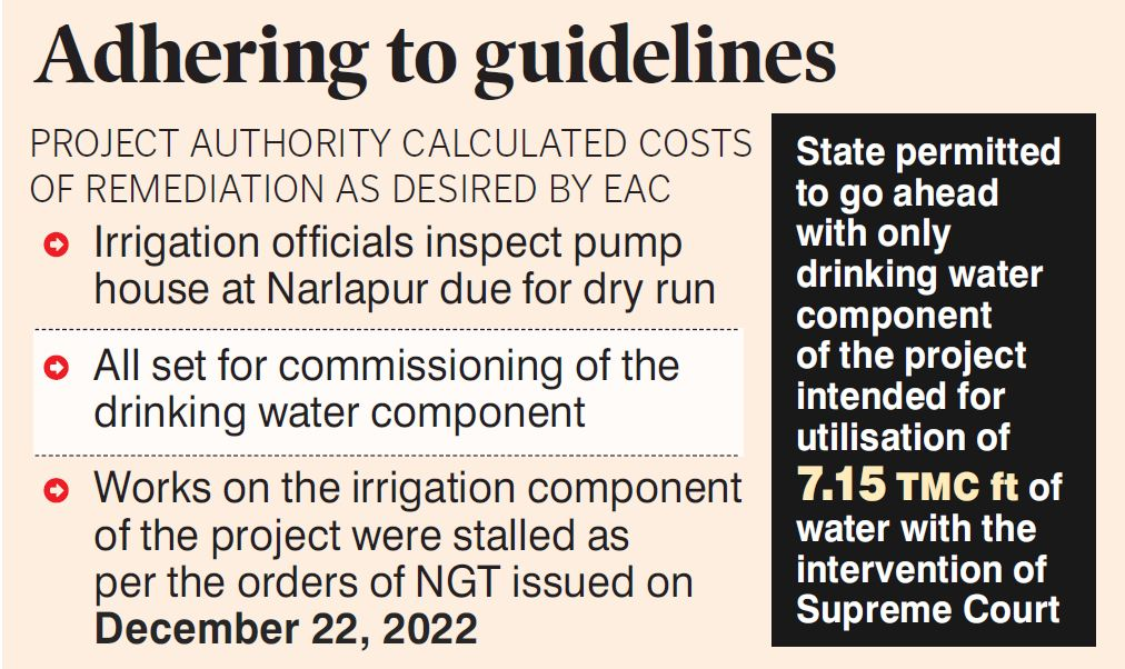 As per the National Green Tribunal (NGT) rulings made on december 22, 2022, project irrigation work has been put on hold. With the help of the supreme Court, the State was given permission to move on with just the drinking water portion of the project that was supposed to use 7.15 TMC ft of water.
